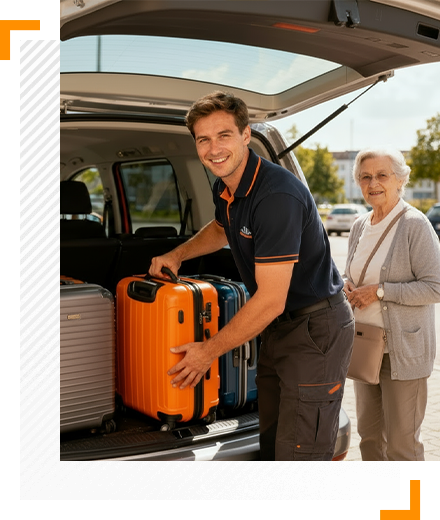 Moderne Fahrzeuge mit automatischer Heckklappe, viel Platz für Rollstühle/Walker. Begleitpersonen willkommen (zusätzlicher Platz vorhanden).